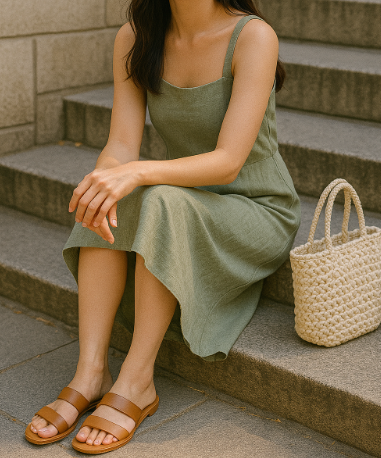 예를 들어 린넨 팬츠나 롱스커트처럼 자연스러운 소재엔 스트랩이 얇은 샌들이 잘 어울려요. 신발도 시원하고 가벼워 보여야 전체 룩이 일체감 있게 느껴져요.